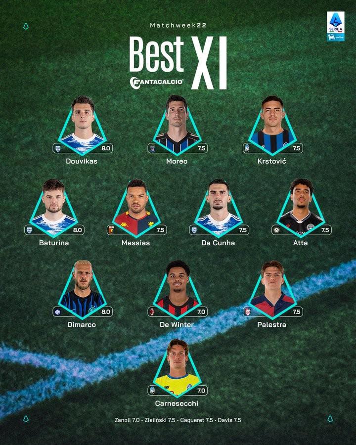 中场:巴图里纳(科莫)、梅西亚斯(热那亚)、达库尼亚(科莫)、阿塔(乌迪内斯)